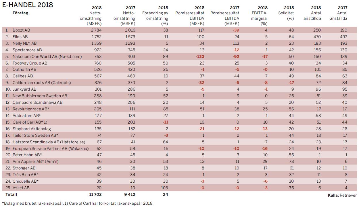 Tillsammans omsatte de 25 bolagen 11,7 miljarder kronor, vilket är en ökning med mer än 2 miljarder kronor, eller 24 procent, jämfört med 2017. Bortsett från Care of Carl, som har ett förkortat räkenskapsår, var det endast Helsingborgsföretaget Tailor Store, som säljer skräddarsydda skjortor på nätet, som tappade omsättning.